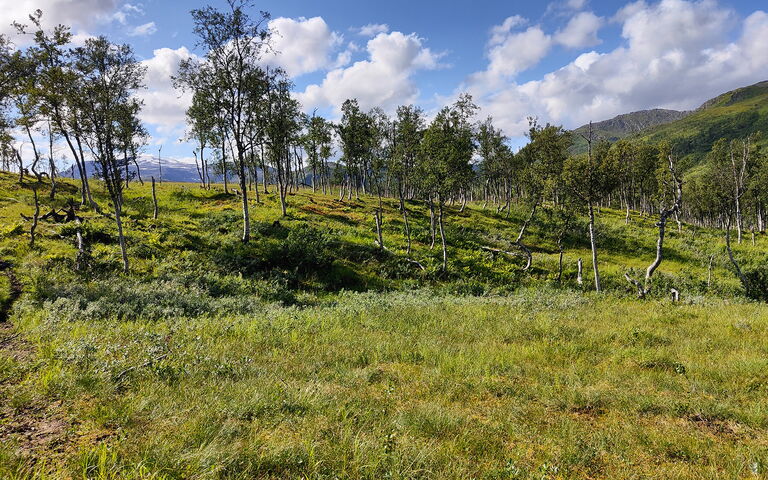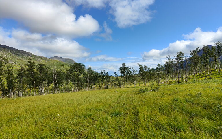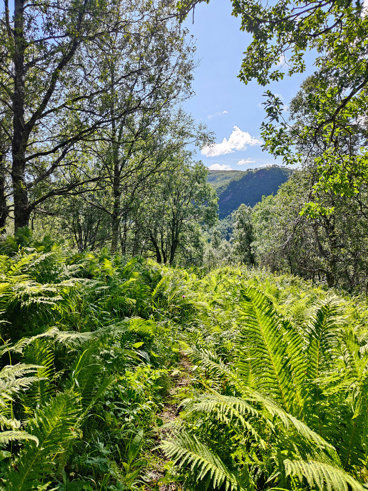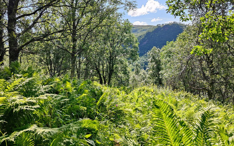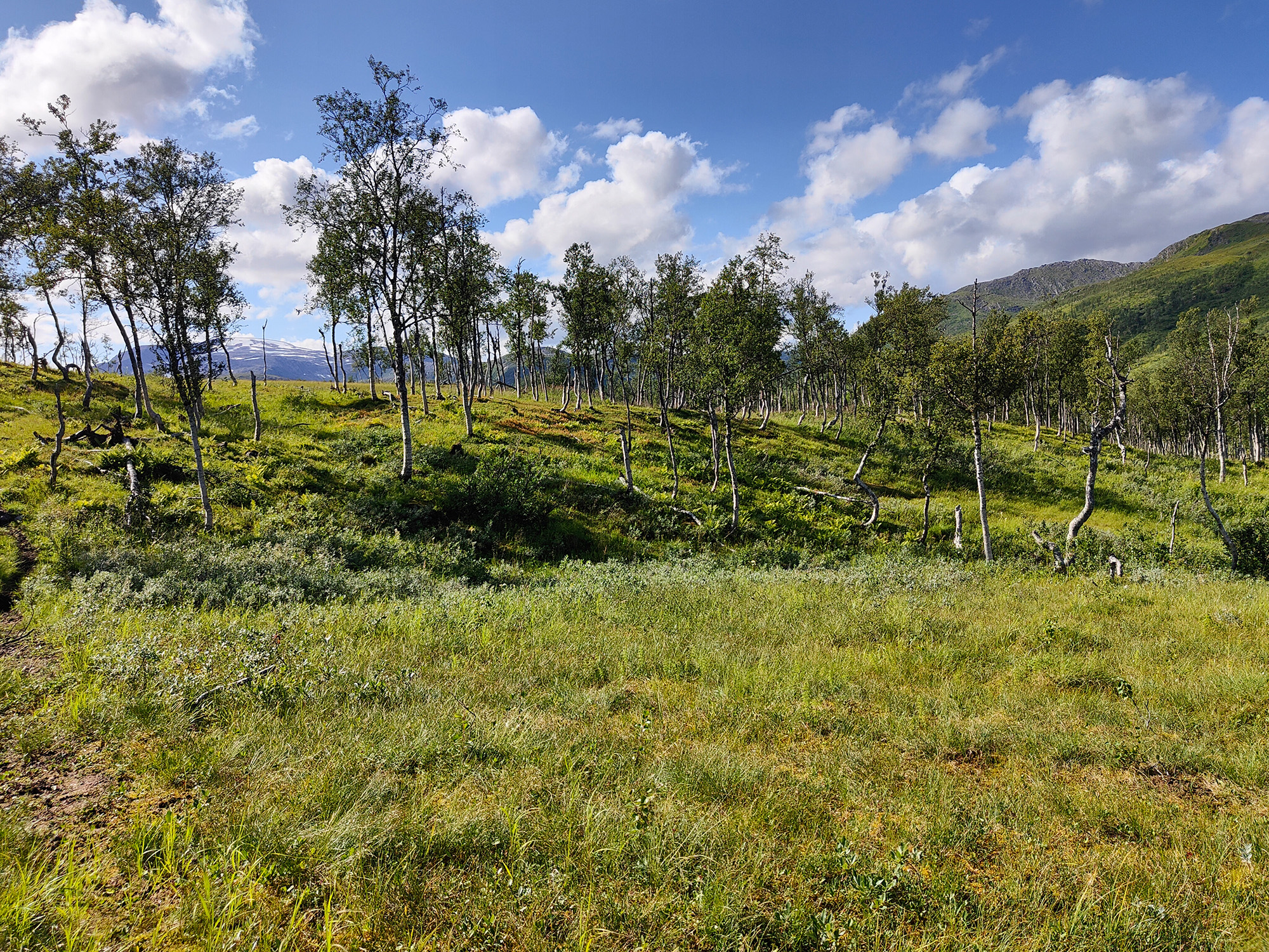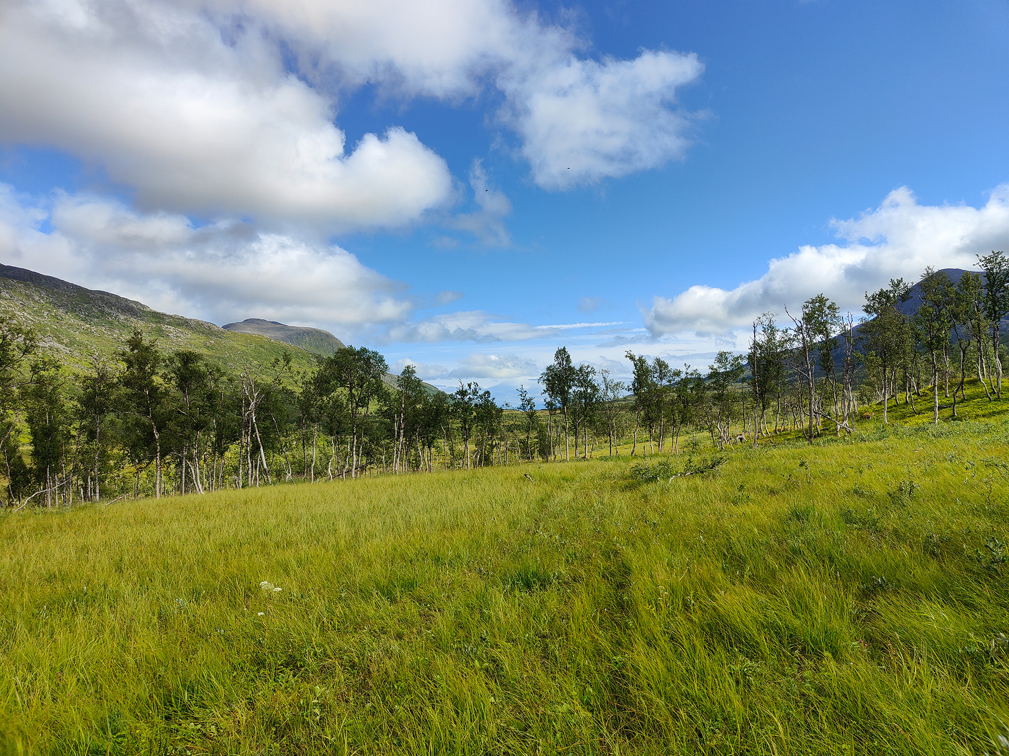 Nach einem ziemlich steilen Aufstieg durch dicht bewachsenen Wald voller Farn, erreichten wir schliesslich schweissgebadet erste lichtere Stellen und eine Hochebene. Es war atemberaubend schön! Keine Menschenseele, nur die Weite, der Wind und saubere Luft. Inzwischen hatten wir auch kurzzeitig wieder Handyempfang, was uns aber nur bestätigte, dass wir am völlig falschen Ort gelandet waren. Jäänu, das Gebiet sah so aus wie wir es uns erhofft hatten und es sah vielversprechend aus, für unsere Suche nach den multebær.