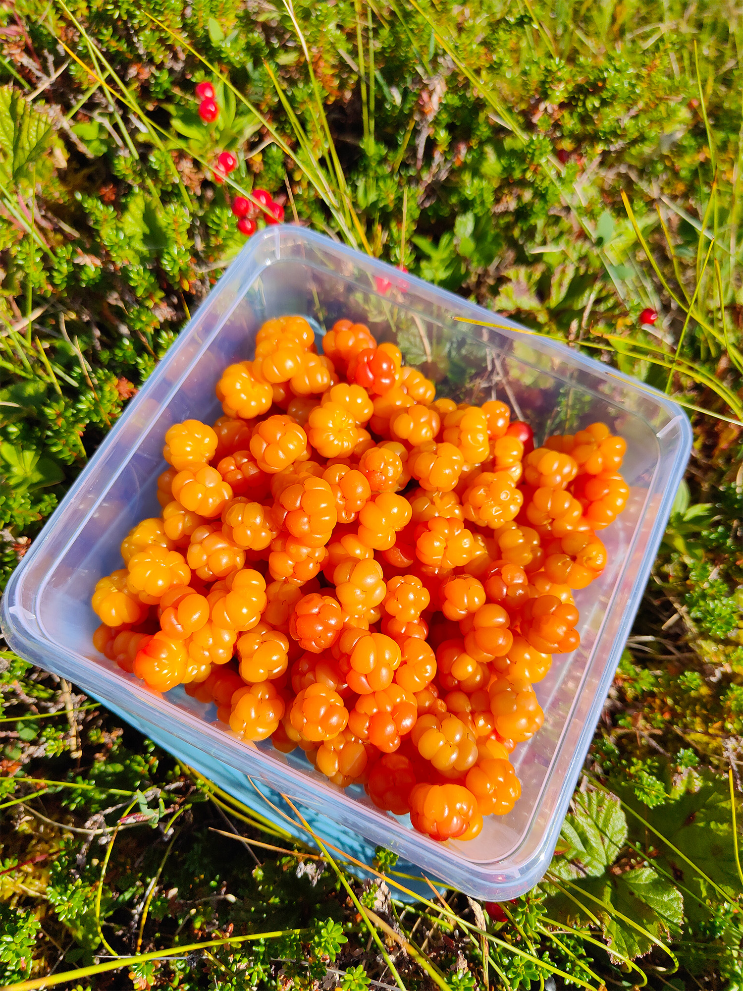 Wir genossen das schöne Wetter, die atemberaubende Landschaft und suchten querfeldein nach orangenen Punkten am Boden. Etwas versteckt (wie könnte es auch anders sein) und in Gesellschaft von Heidelbeeren und Krähenbeeren fanden wir sie schliesslich! Teilweise nur wenige einzelne Exemplare, teilweise aber auch viele Beeren auf wenigen Metern. Nun war es an der Zeit, die mitgebrachten Tupperware auszupacken und zu sammeln 😊