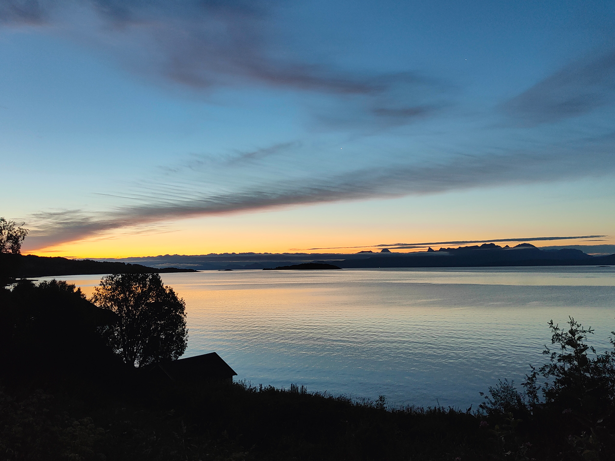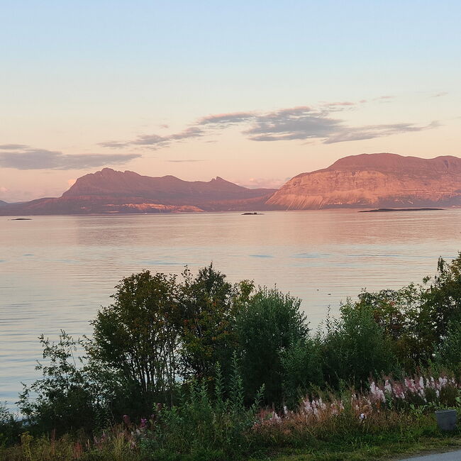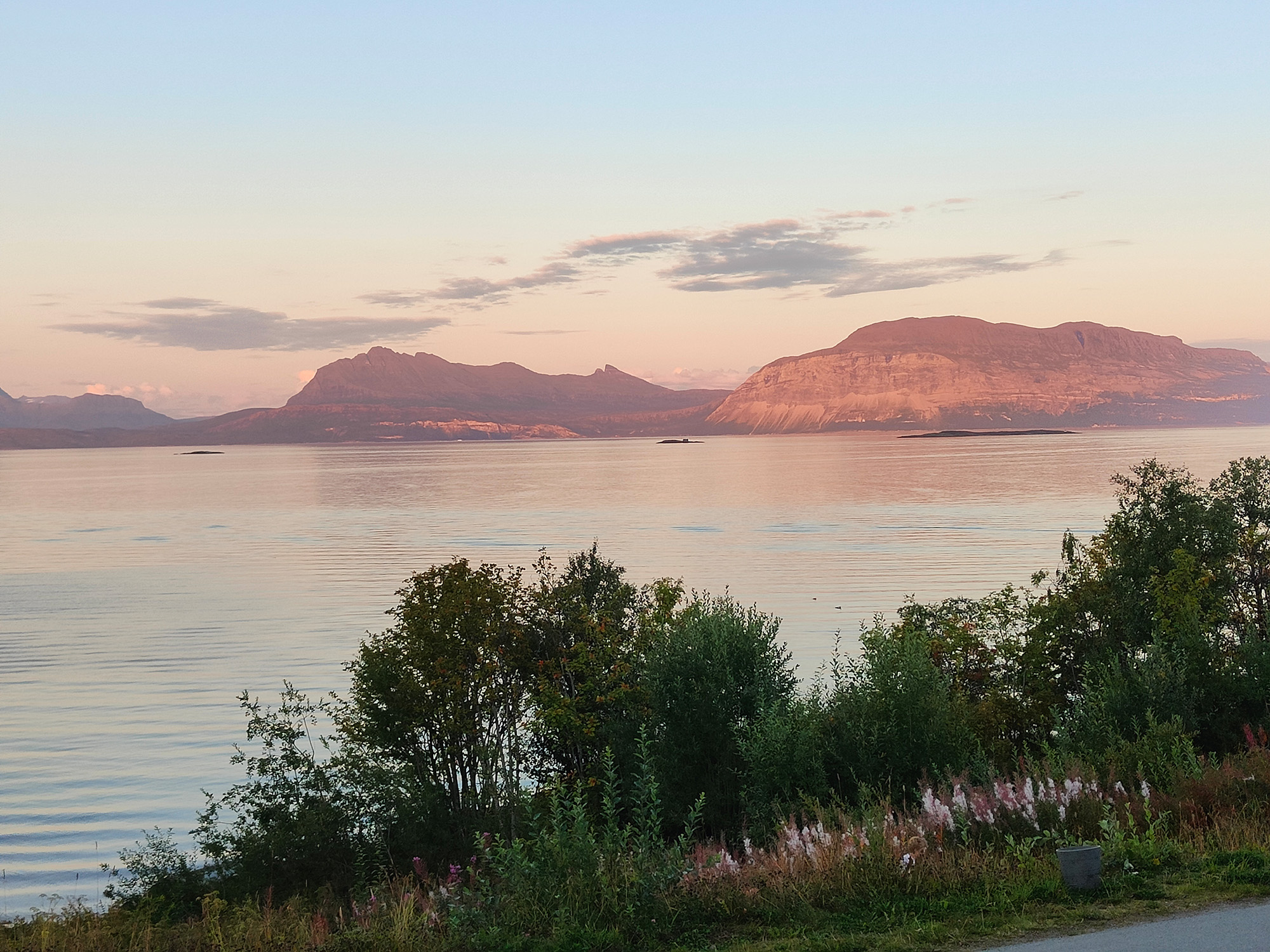 Die Einheimischen sprechen bereits seit 3 Wochen vom Herbst, der Sommer sei nun vorbei und es wird nachts auch wieder dunkel. Trotzdem fühlt es sich manchmal an, wie der Spätsommer in der Schweiz. Wir hatten nun mehrere Tage strahlenden Sonnenschein bei ca. 18°, wenn es jedoch bewölkt ist, wird es schnell kälter und man merkt, jaaa doch, es ist bereits jetzt Herbst hier im Norden. Die Birken werden gelb, die Bodendecker auf den Hochebenen rot und die Zeit der langen Sonnenuntergänge hat auch nördlich des Polarkreises wieder begonnen. Ich liebe diese Jahreszeit! Das Licht ist einfach nur magisch, wir konnten noch in keinem Foto einfangen, wie es wirklich aussieht. Teilweise ist der Himmel richtiggehend kitschig 😉 Sonnenuntergänge mit Farbverlauf von Rot-Orange zu Hellblau und rosarote Wolken, die aussehen wie Zuckerwatte. Dazwischen der aufgehende Mond, welcher auf der Meeresoberfläche spiegelt – es sieht aus wie auf einem richtig übertriebenen Gemälde und doch, es ist echt. Die Natur zaubert hier Spektakel an den Himmel, welche man einfach gesehen haben muss!