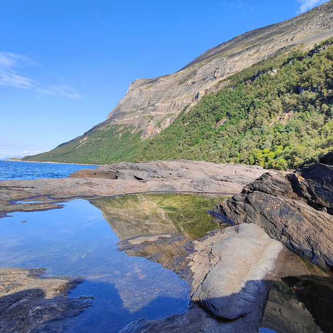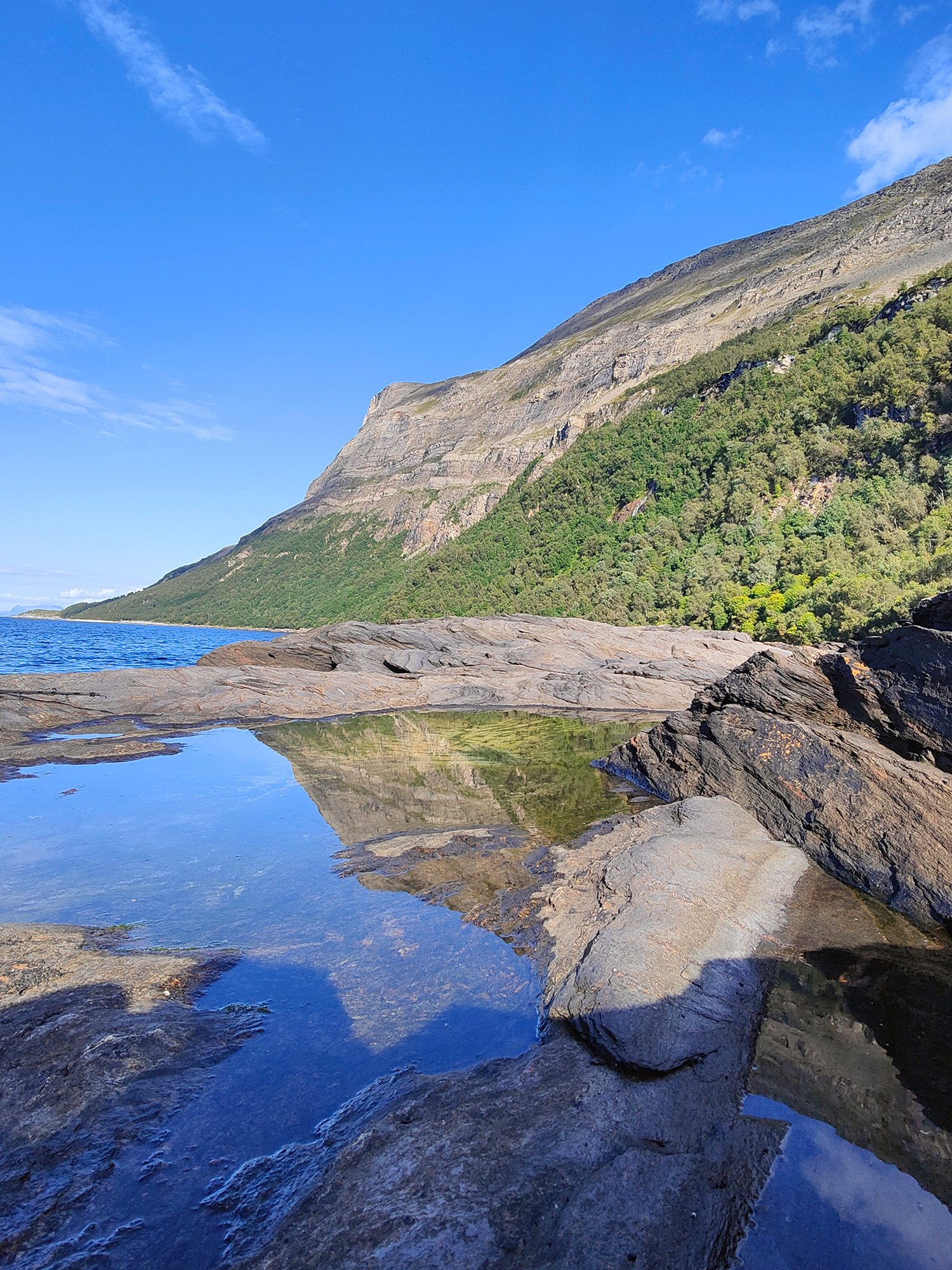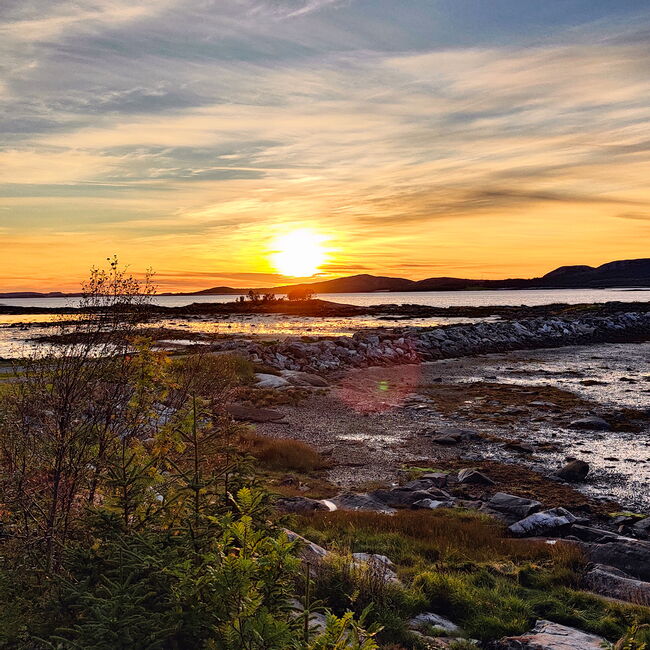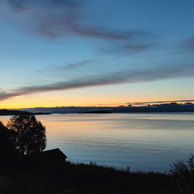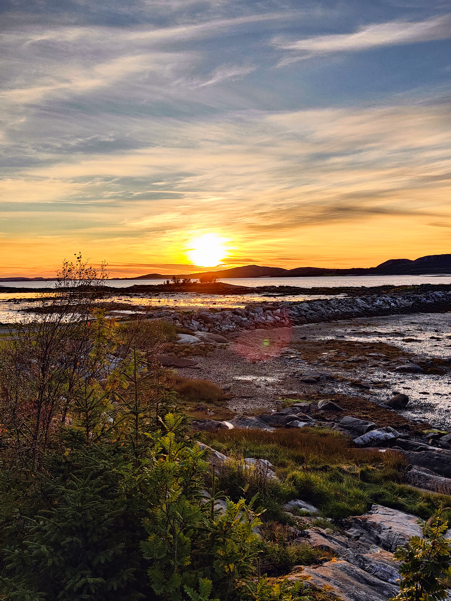 Die Einheimischen sprechen bereits seit 3 Wochen vom Herbst, der Sommer sei nun vorbei und es wird nachts auch wieder dunkel. Trotzdem fühlt es sich manchmal an, wie der Spätsommer in der Schweiz. Wir hatten nun mehrere Tage strahlenden Sonnenschein bei ca. 18°, wenn es jedoch bewölkt ist, wird es schnell kälter und man merkt, jaaa doch, es ist bereits jetzt Herbst hier im Norden. Die Birken werden gelb, die Bodendecker auf den Hochebenen rot und die Zeit der langen Sonnenuntergänge hat auch nördlich des Polarkreises wieder begonnen. Ich liebe diese Jahreszeit! Das Licht ist einfach nur magisch, wir konnten noch in keinem Foto einfangen, wie es wirklich aussieht. Teilweise ist der Himmel richtiggehend kitschig 😉 Sonnenuntergänge mit Farbverlauf von Rot-Orange zu Hellblau und rosarote Wolken, die aussehen wie Zuckerwatte. Dazwischen der aufgehende Mond, welcher auf der Meeresoberfläche spiegelt – es sieht aus wie auf einem richtig übertriebenen Gemälde und doch, es ist echt. Die Natur zaubert hier Spektakel an den Himmel, welche man einfach gesehen haben muss!
